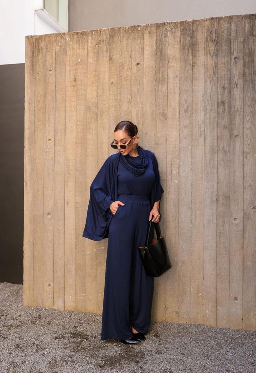 Trijunto elegante em azul marinho, composto por blusa de gola drapeada, calça pantalona fluida e kimono leve. Confortável e sofisticado, é a escolha ideal para ocasiões que pedem estilo sem abrir mão da praticidade.