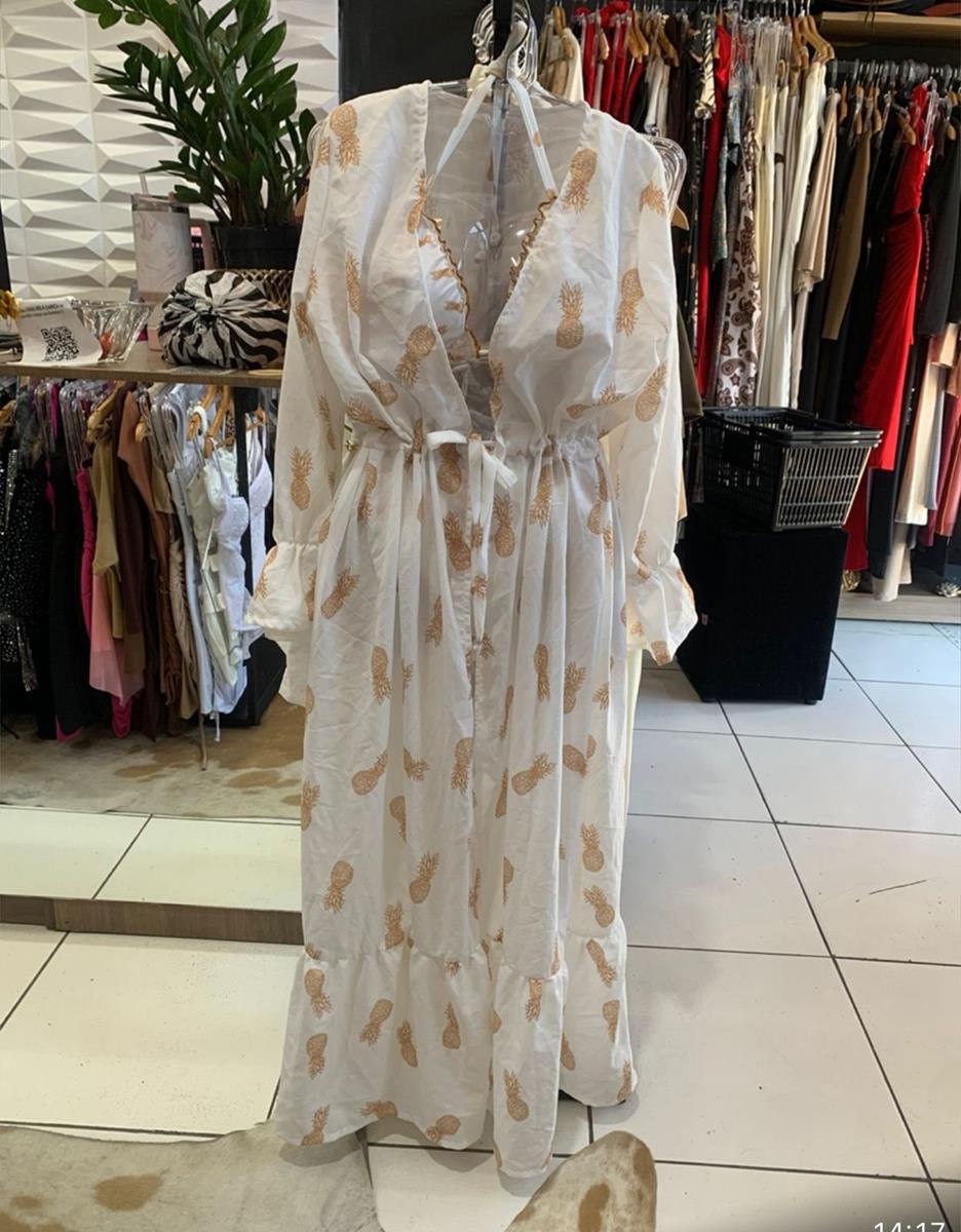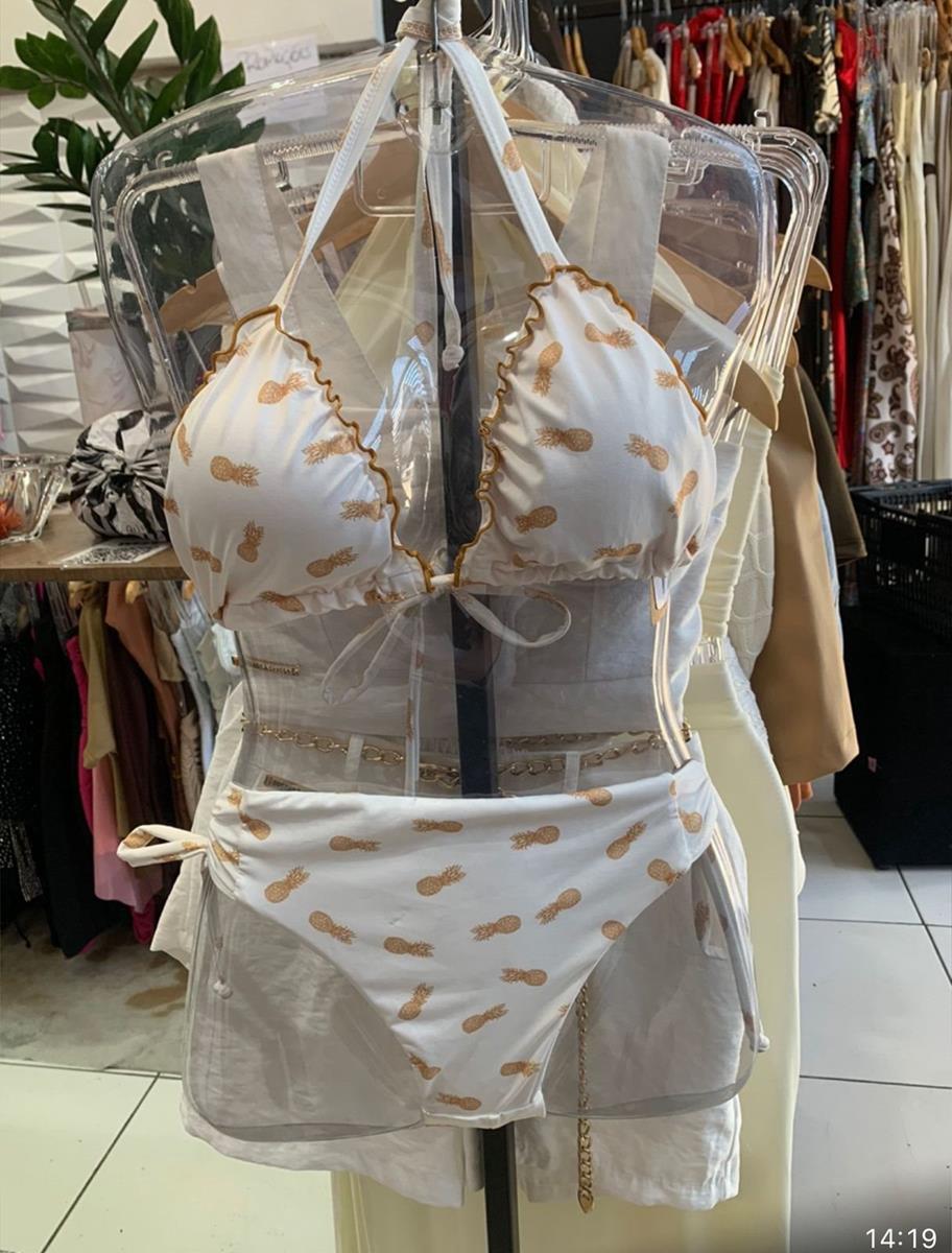 Com estampa delicada de abacaxis dourados, o conjunto inclui biquíni e saída de praia longa, criando aquele visual fresh e sofisticado para brilhar nos dias de sol.