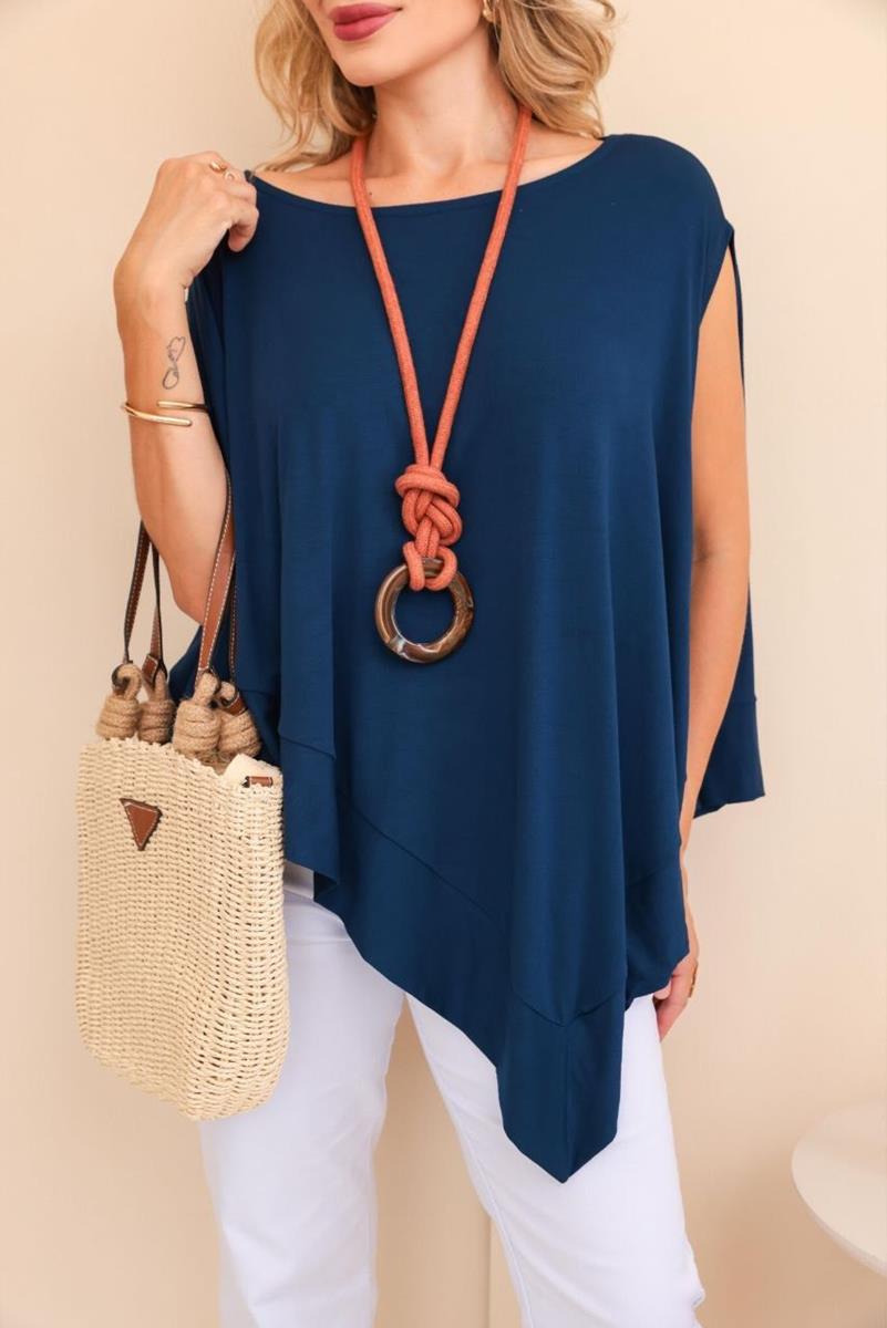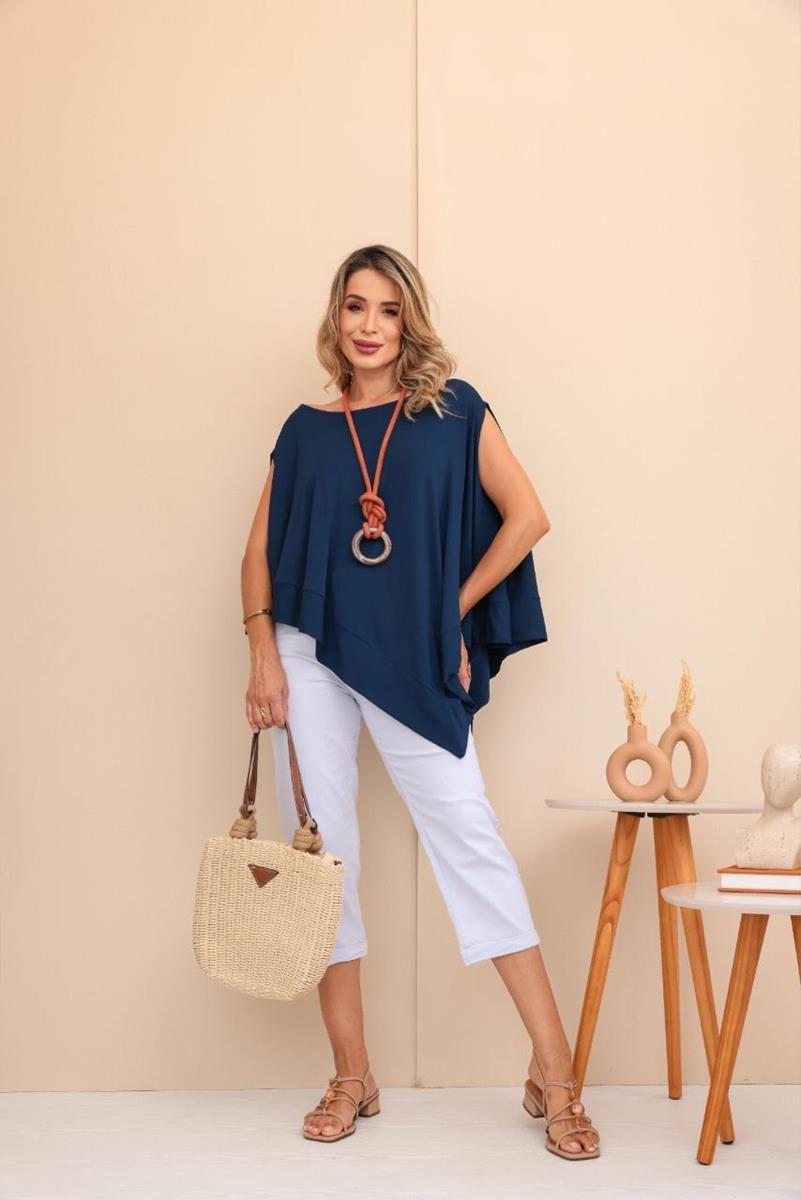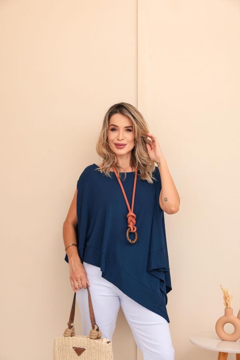Elegante e moderna, essa blusa é a escolha perfeita para quem ama unir conforto e estilo. Seu caimento solto e modelagem assimétrica proporcionam leveza e movimento, enquanto o tom azul profundo transmite sofisticação e harmonia. Confeccionada em tecido leve e fluido, ela é ideal para compor looks casuais ou sofisticados — basta mudar os acessórios. Combine com calça branca ou jeans e arrase em qualquer ocasião!