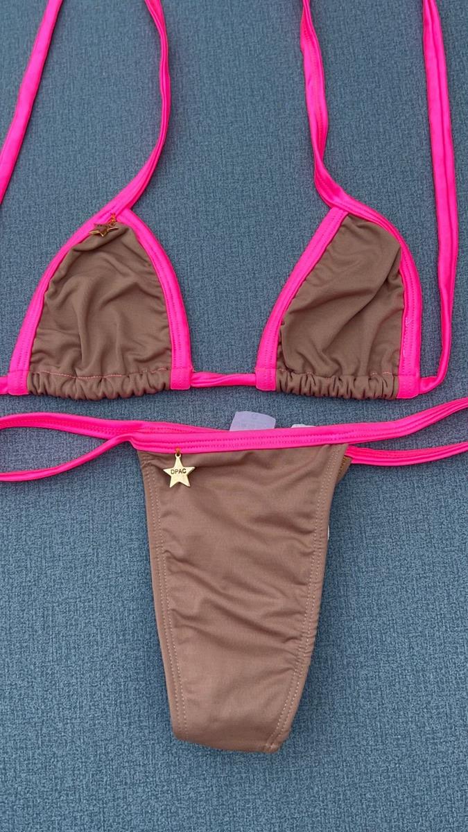 Conjunto Biquíni Cortininha Tanga Fio com Viés Rosa Neon e Pingente de Estrela. Peça ousada em tecido marrom/nude contrastando com amarrações vibrantes em pink neon. Possui charmoso detalhe de estrela dourada.