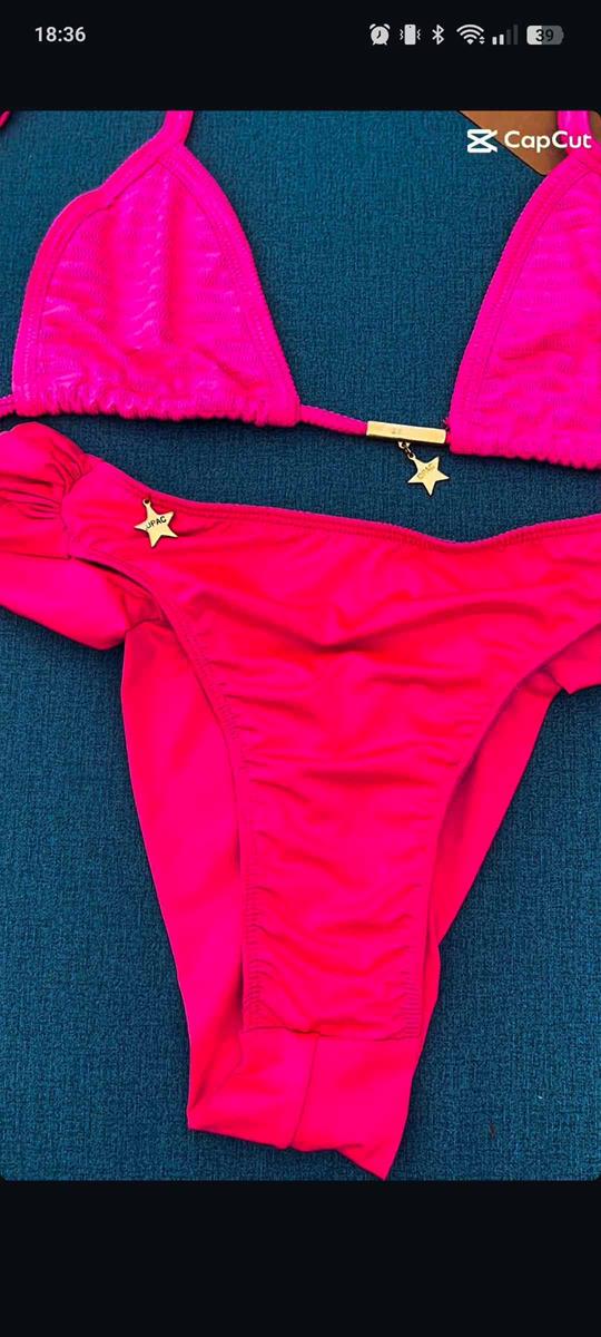 Biquíni com combinação de cores vibrantes Pink , possui modelagem semi-fio (ou empina bumbum / ripple) e charmosas laterais franzidas (drapeadas). O detalhe final é o pingente de estrela dourada na lateral do cós da calcinha.