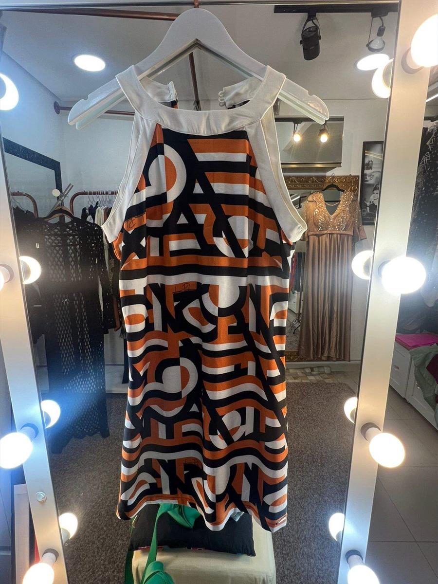 Vestido curto com estampa geométrica moderna em tons de laranja, preto e branco. Modelagem soltinha, confortável e elegante, com gola estruturada que dá um toque chic ao look. Perfeito para um visual urbano e estiloso, sem esforço.