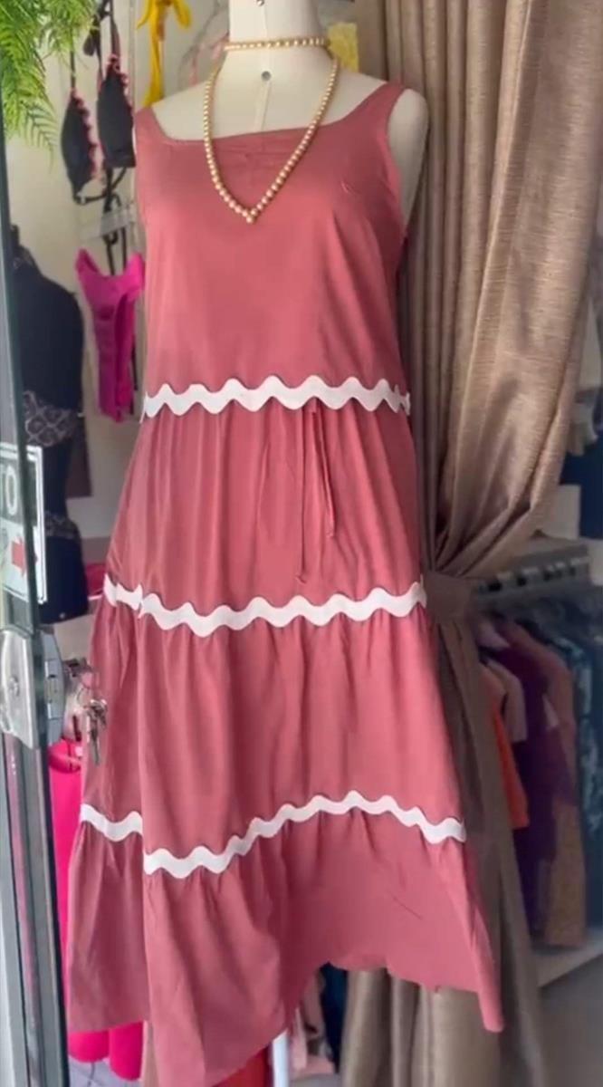 Vestido midi em tom terroso com modelagem soltinha e caimento leve. Possui detalhes em ondas brancas nas camadas, trazendo movimento e um toque romântico ao visual. Fresco, confortável e perfeito para dias quentes ou looks delicados com estilo.