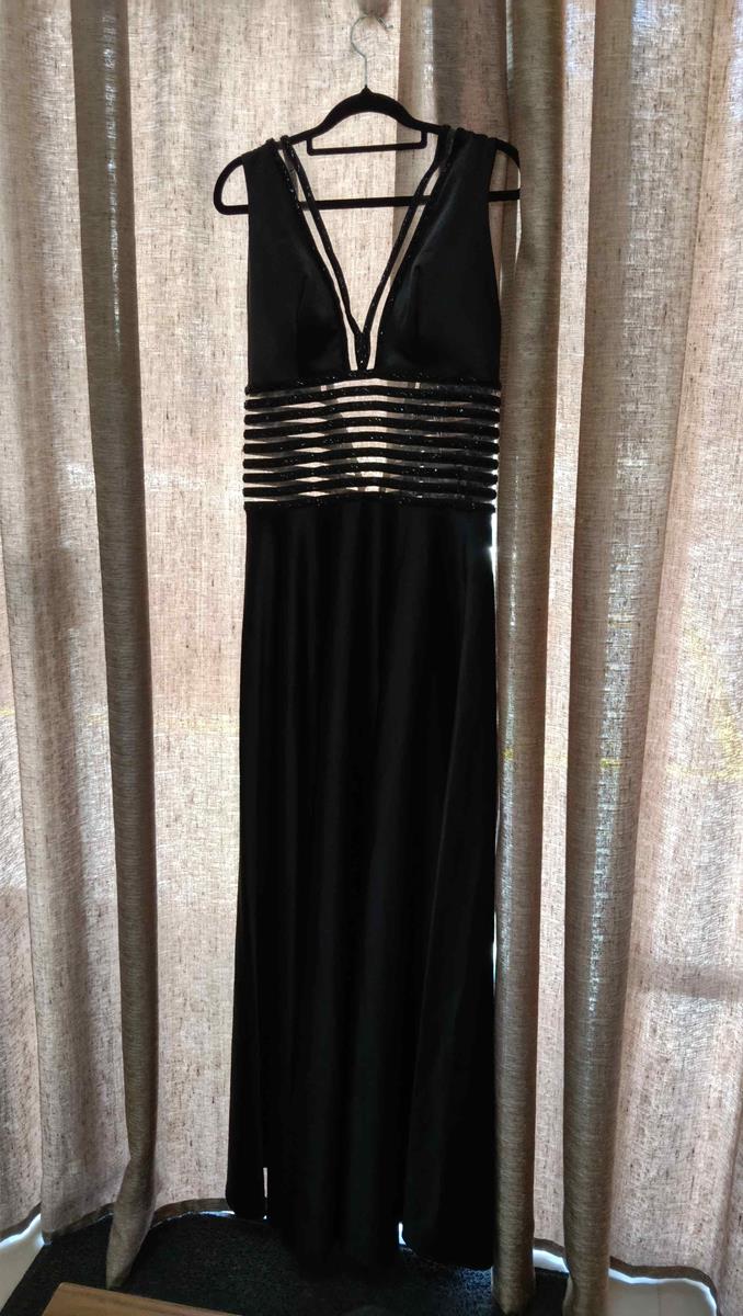 Vestido longo preto, com decote em V profundo, recortes horizontais na cintura e alças finas