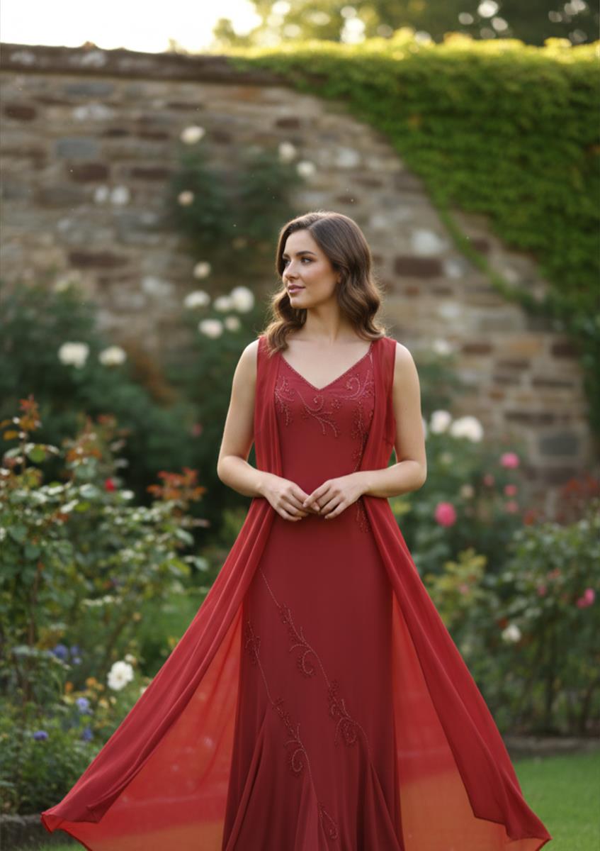 O Vestido Rubi Majestoso é uma peça deslumbrante que combina um busto estruturado com delicados bordados em relevo a uma saia fluida de caimento leve, elevando o visual com uma capa longa removível que parte das alças, conferindo um ar dramático, imponente e digno de realeza para eventos de gala.