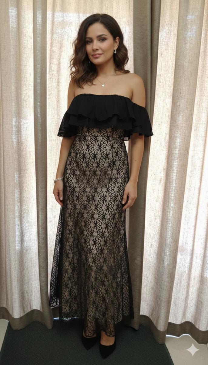 Vestido longo preto com design sofisticado e feminino. Possui decote ombro a ombro com babado duplo em tecido leve e fluido, criando movimento e delicadeza na parte superior. O corpo é ajustado e valoriza a silhueta, enquanto a saia longa em renda com forro nude cria um elegante efeito de transparência, destacando o desenho floral da renda. Ideal para eventos formais, festas e ocasiões especiais
