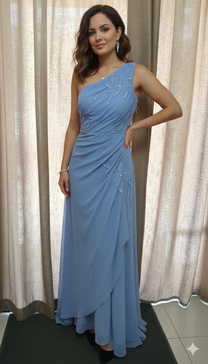 Vestido longo azul de um ombro com drapeado e pedrarias
