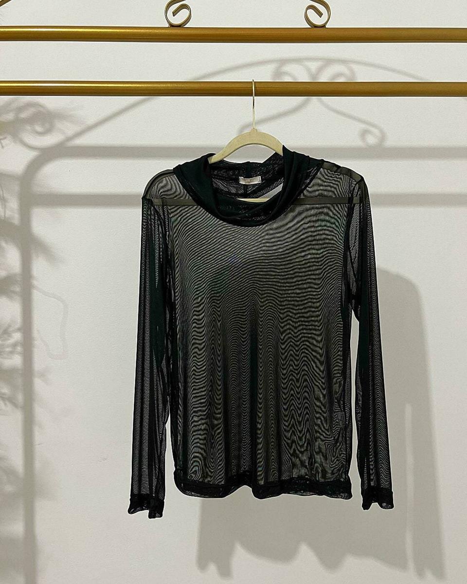 ? Blusa preta de tule transparente, manga longa, modelagem soltinha e leve. Ideal para sobreposição, trazendo estilo moderno e versátil para compor looks do dia ou da noite.