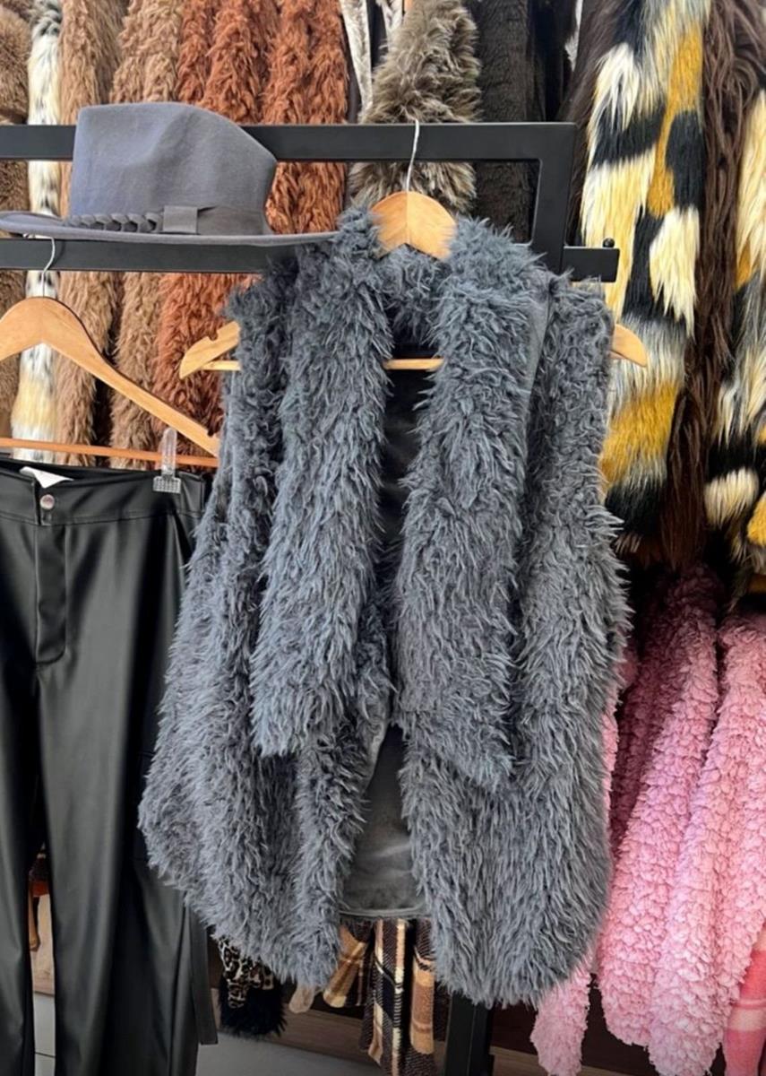 Colete de pelúcia cinza chumbo, com textura macia e volumosa que traz modernidade e conforto ao look. Ideal para sobreposições estilosas em dias frios, unindo elegância e versatilidade.
