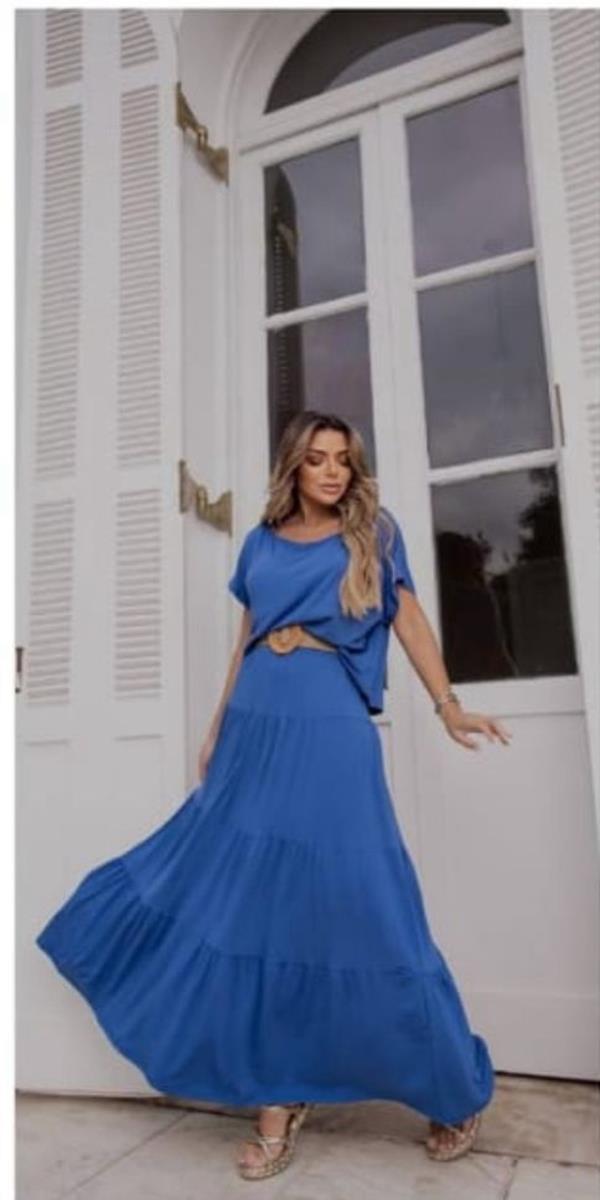 Conjunto azul royal com blusa soltinha e saia longa fluida em camadas, perfeito para compor um visual leve, elegante e cheio de movimento. O cinto marcando a cintura valoriza a silhueta, trazendo um toque moderno e sofisticado. Ideal para dias ensolarados ou eventos casuais com estilo! veste 38 ao 46