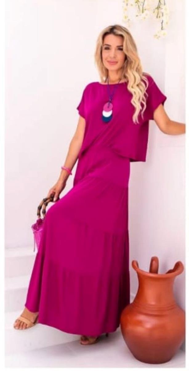 Conjunto Rosa royal com blusa soltinha e saia longa fluida em camadas, perfeito para compor um visual leve, elegante e cheio de movimento. O cinto marcando a cintura valoriza a silhueta, trazendo um toque moderno e sofisticado. Ideal para dias ensolarados ou eventos casuais com estilo! veste 38 ao 46