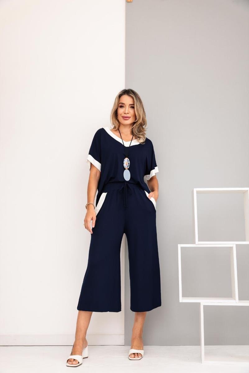 O Conjunto Navy Elegance une conforto e sofisticação em uma única peça. Com blusa soltinha e calça pantacourt em tecido leve, ele traz detalhes em off white que realçam o visual com um toque refinado. O elástico na cintura com amarração garante ajuste perfeito, enquanto o caimento fluido proporciona movimento e elegância. Ideal para o dia a dia, viagens ou eventos casuais onde o conforto encontra o charme.