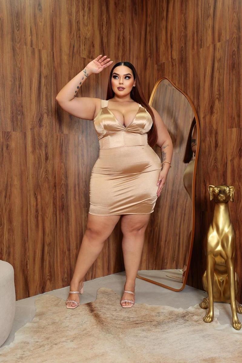 Com tecido acetinado e modelagem que valoriza as curvas, o Golden Glow é perfeito pra quem quer brilhar com sofisticação e confiança.