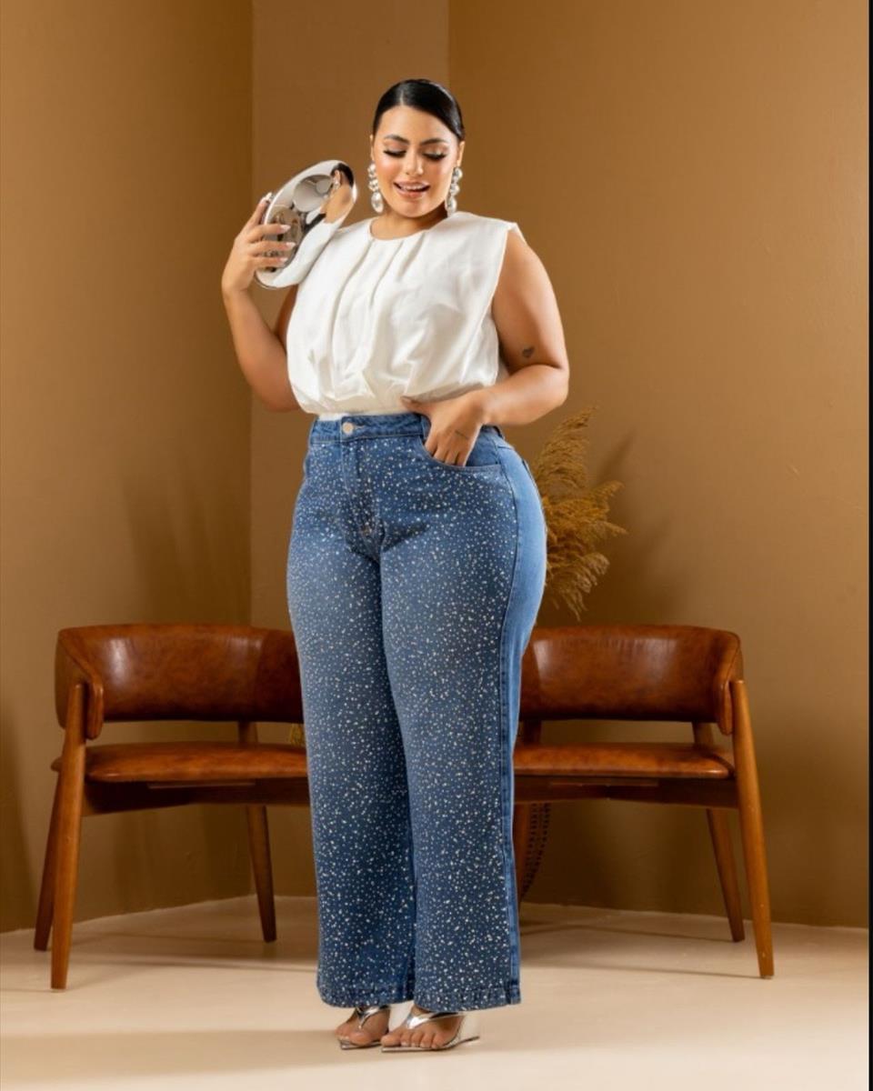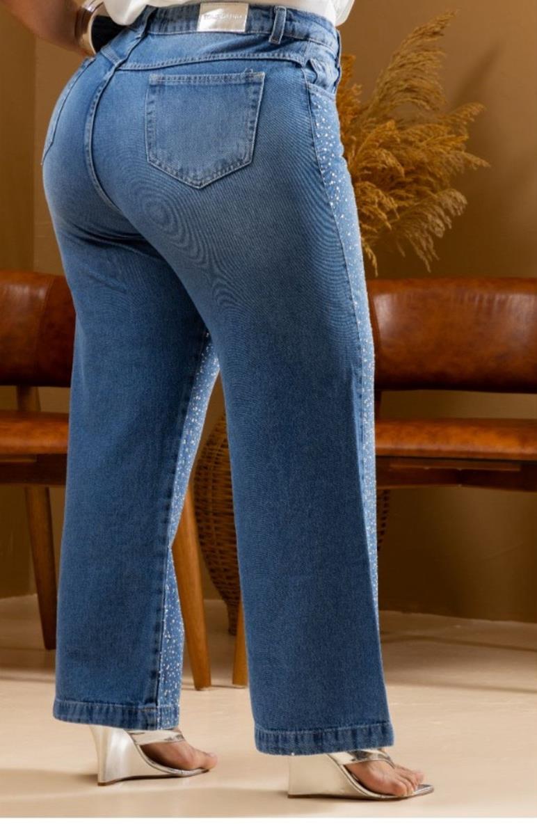 Calça jeans Plus de lavagem azul clássica com modelagem wide leg (pernas largas) e cintura alta, no estilo cargo (com bolsos laterais). A peça é totalmente adornada com aplicações de strass/pedraria, criando um efeito cintilante. Uma peça ousada que une o conforto do jeans reto ao glamour para festas e eventos noturnos.
