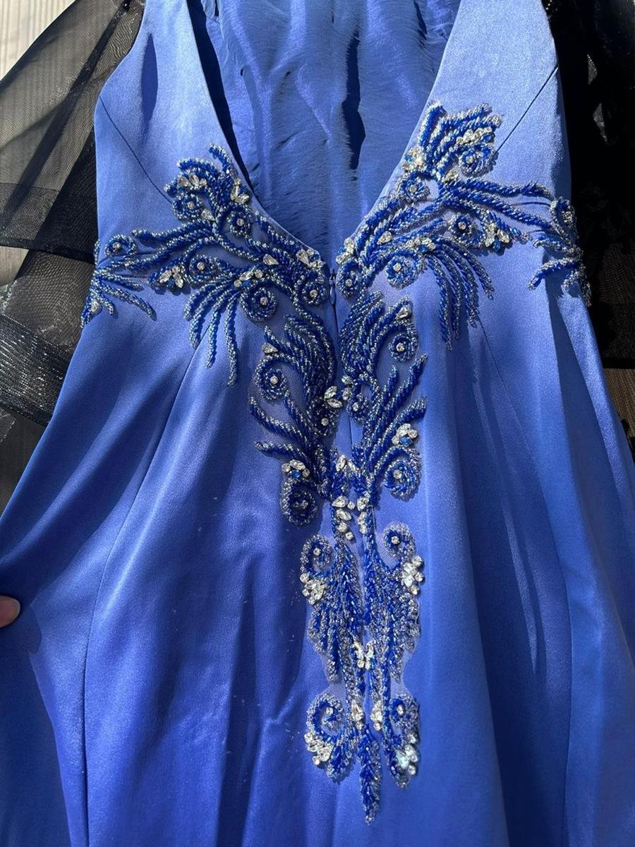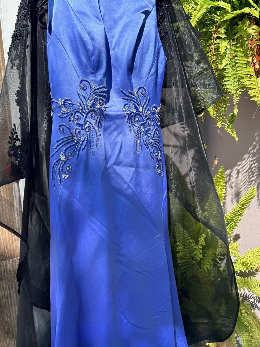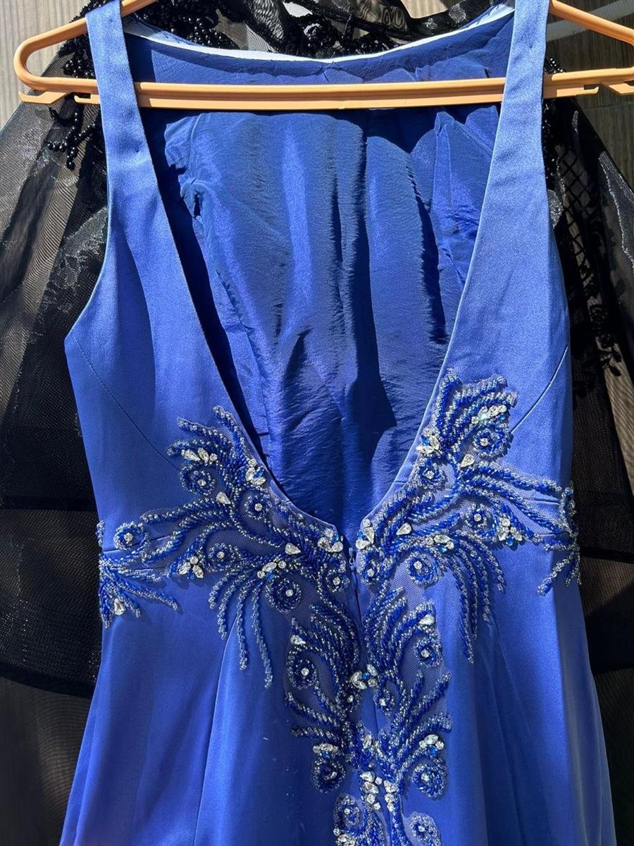 O vestido é longo, de cor azul-royal, com um tecido liso e brilhante, possivelmente cetim. Na região da cintura, há bordados ornamentados com miçangas e pedrarias prateadas e azuis, formando um padrão floral ou de arabescos em ambos os lados. A peça é acompanhada por uma estola preta, transparente e com detalhes em renda na borda.