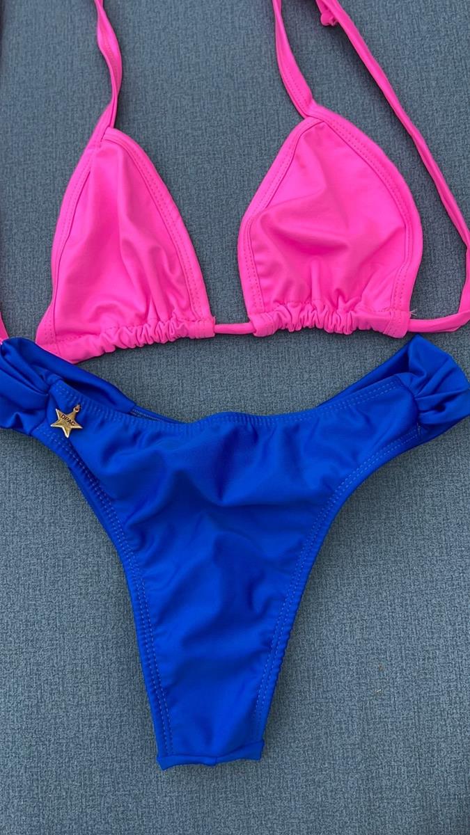 Biquíni com combinação de cores vibrantes: Top Cortininha na cor Pink Neon (ou Pink Vibrante) para realçar o bronzeado. A calcinha, em um tom de Azul Royal, possui modelagem semi-fio (ou empina bumbum / ripple) e charmosas laterais franzidas (drapeadas). O detalhe final é o pingente de estrela dourada na lateral do cós da calcinha.