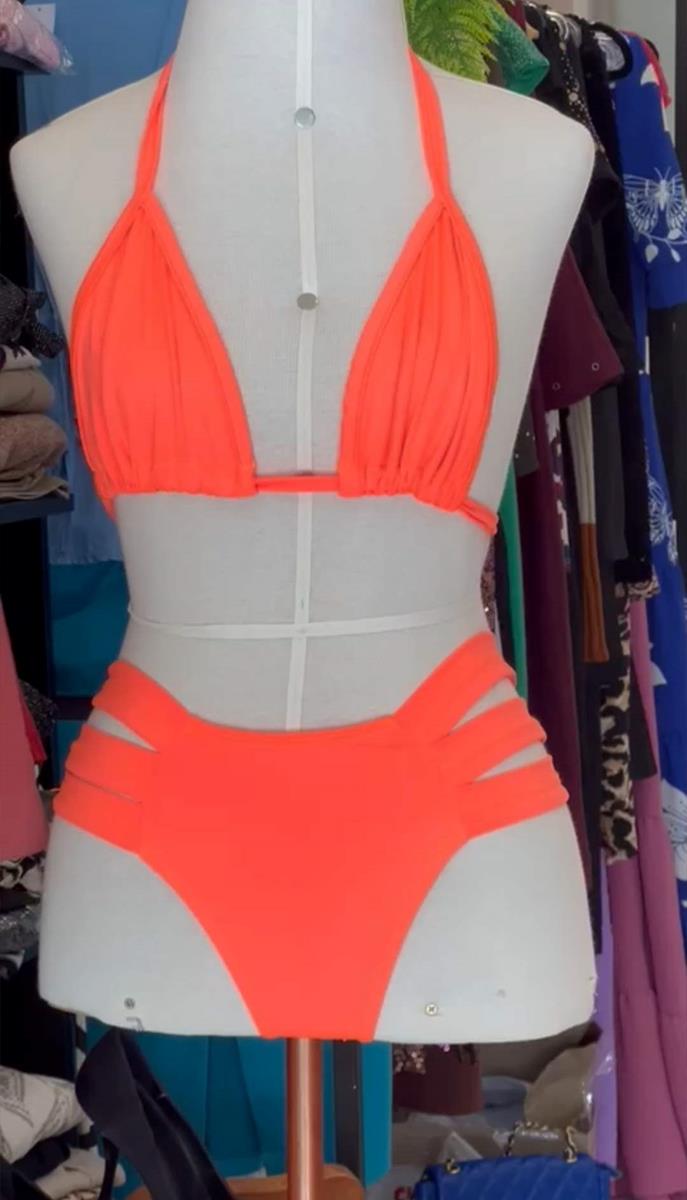 Vibrante e Ousado: Este Biquíni Neon na cor laranja ou coral é ideal para quem quer um visual de alto impacto. O top é no modelo cortininha (triângulo), mas com um diferencial: o tecido é totalmente franzido (ripple) nas taças, o que cria textura e volume. A calcinha possui uma modelagem moderna e ousada, com recortes horizontais (tiras) na lateral da cintura, que valorizam as curvas e garantem um ajuste seguro. É uma peça moderna e perfeita para destacar o bronzeado.