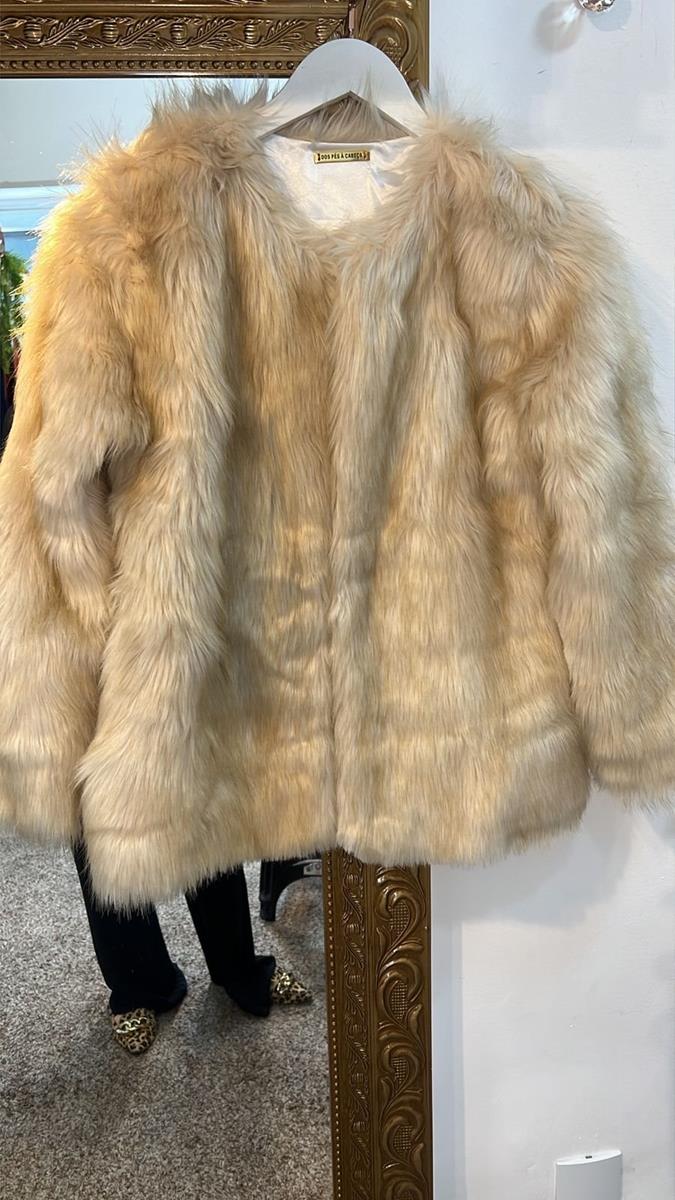 Conforto e Glamour Suave: Este Casaco de Pelo Sintético (Fake Fur) oferece um visual luxuoso e aquecido para o inverno. Sua cor clara e neutra (bege, nude ou off-white) confere sofisticação e versatilidade, combinando facilmente com diversas cores. A peça é caracterizada por pelos longos e volumosos, que proporcionam uma textura rica e um caimento oversized. Sem gola aparente e com abertura frontal, é ideal para sobrepor looks de festa ou adicionar um toque de elegância a produções casuais de inverno.