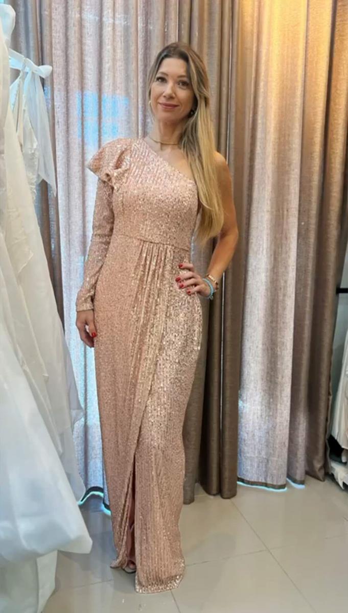 Vestido longo em tom rosé com brilho intenso em paetês, modelagem ajustada ao corpo, com decote assimétrico de um ombro só. Possui uma manga longa de um lado e aplicação delicada em laço estruturado no ombro, trazendo charme e sofisticação. A cintura é levemente marcada, e a saia tem caimento reto com leve evasê na barra e fenda frontal sutil, que alonga a silhueta e garante elegância ao caminhar.