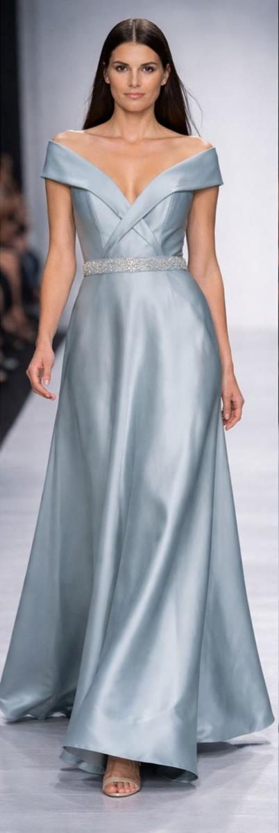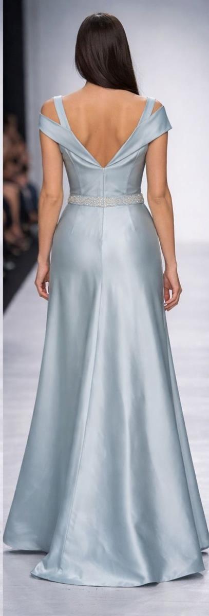 Vestido longo em tom azul acinzentado com acabamento acetinado, trazendo brilho suave e sofisticado. Possui decote ombro a ombro com detalhe cruzado no busto, valorizando o colo, e cintura marcada com aplicação delicada. A saia é fluida, com caimento impecável, ideal para eventos formais, casamentos e ocasiões elegantes.
