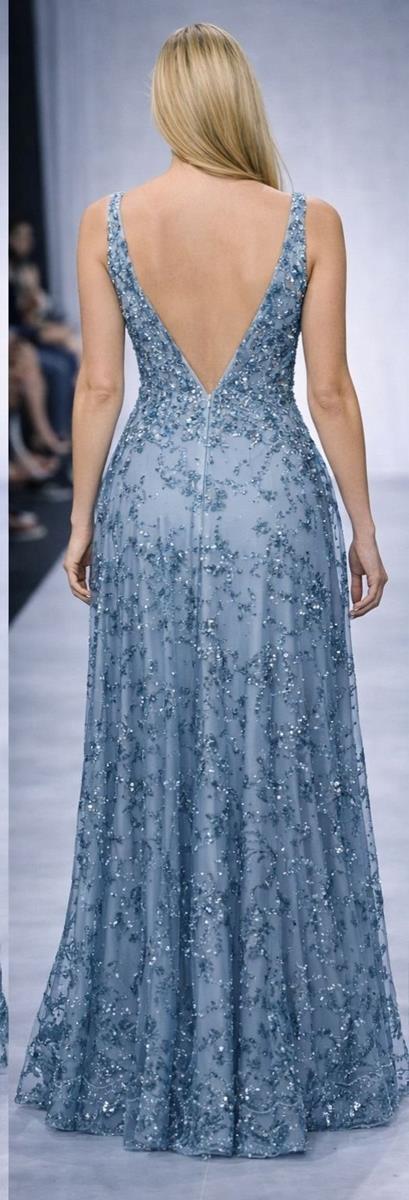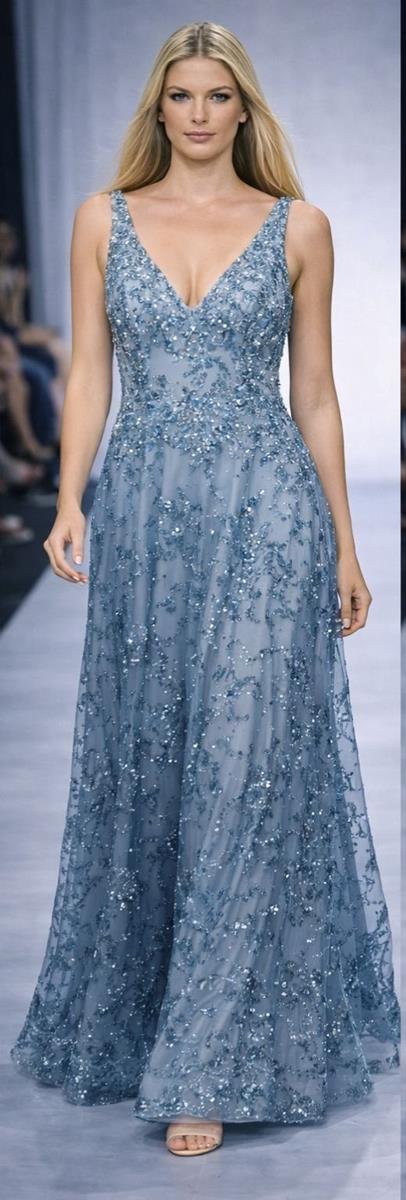 | VESTIDO DE FESTA LONGO NA COR AZUL-POEIRA | INTEIRAMENTE CONFECCIONADO EM TULE COM BORDADOS FLORAIS E APLICAÇÕES DE PAETÊS. O MODELO POSSUI DECOTE EM "V", ALÇAS MÉDIAS E UMA SAIA COM CORTE EM "A" QUE PROPORCIONA UM CAIMENTO FLUIDO E BRILHANTE |
